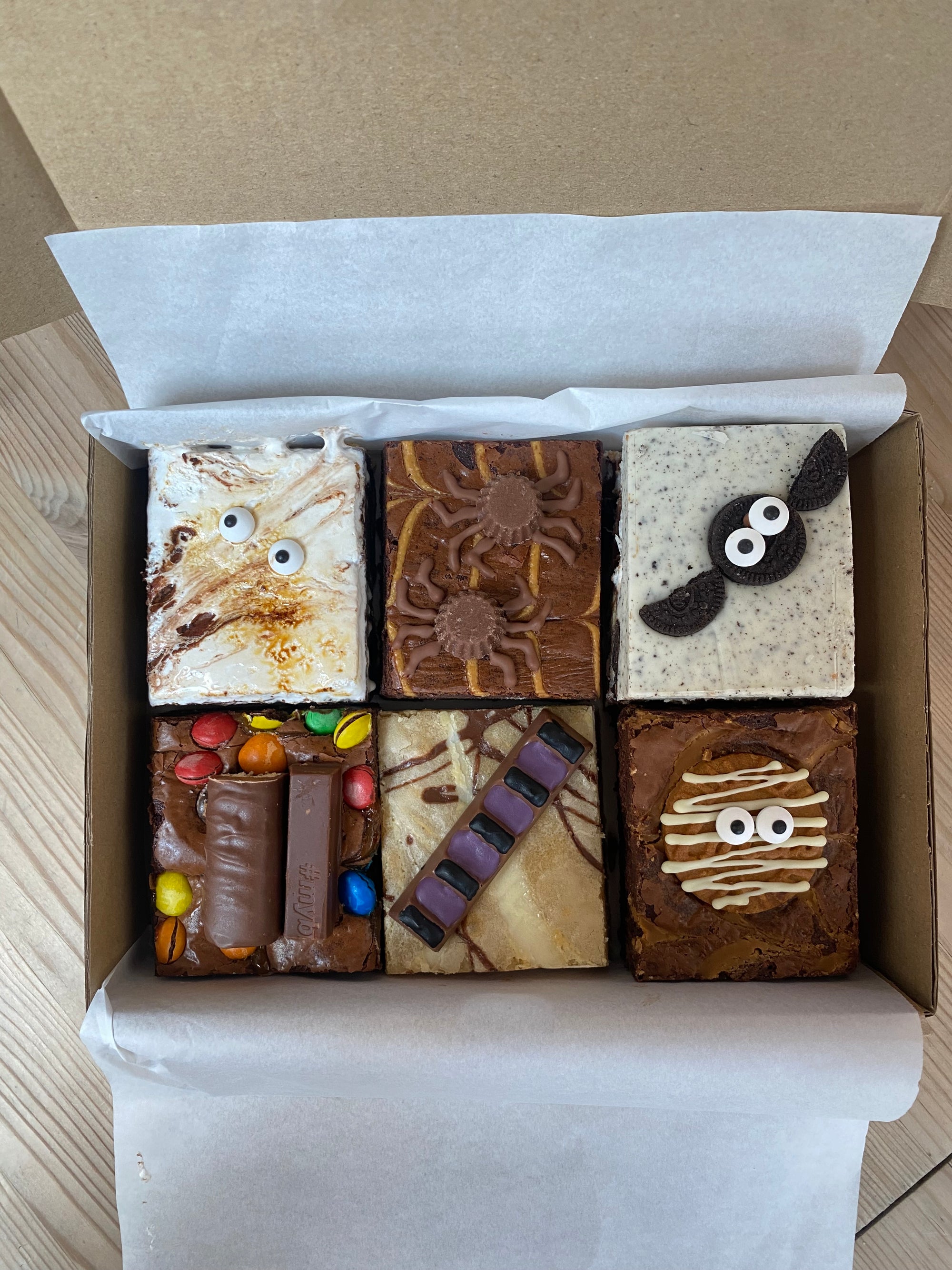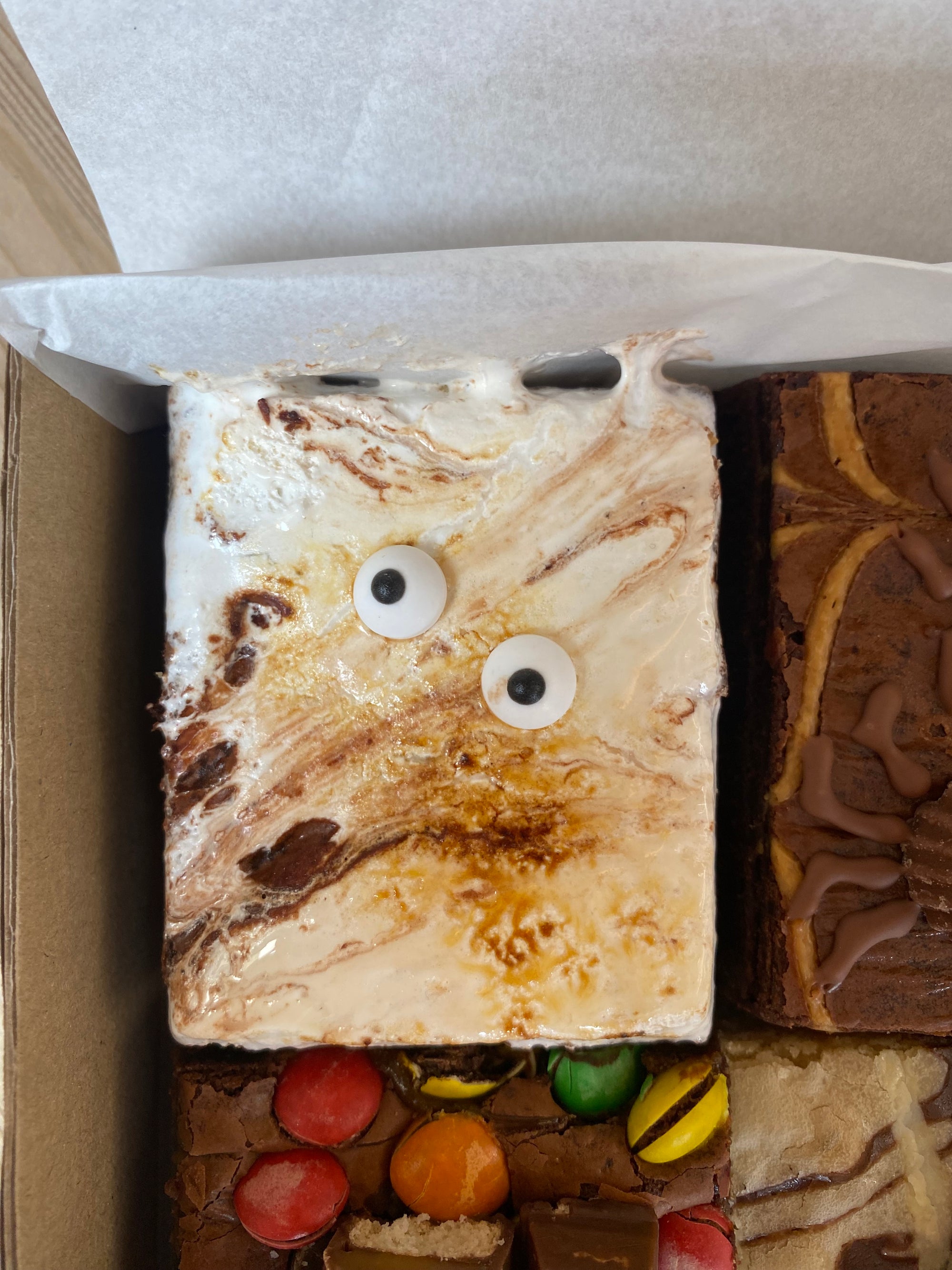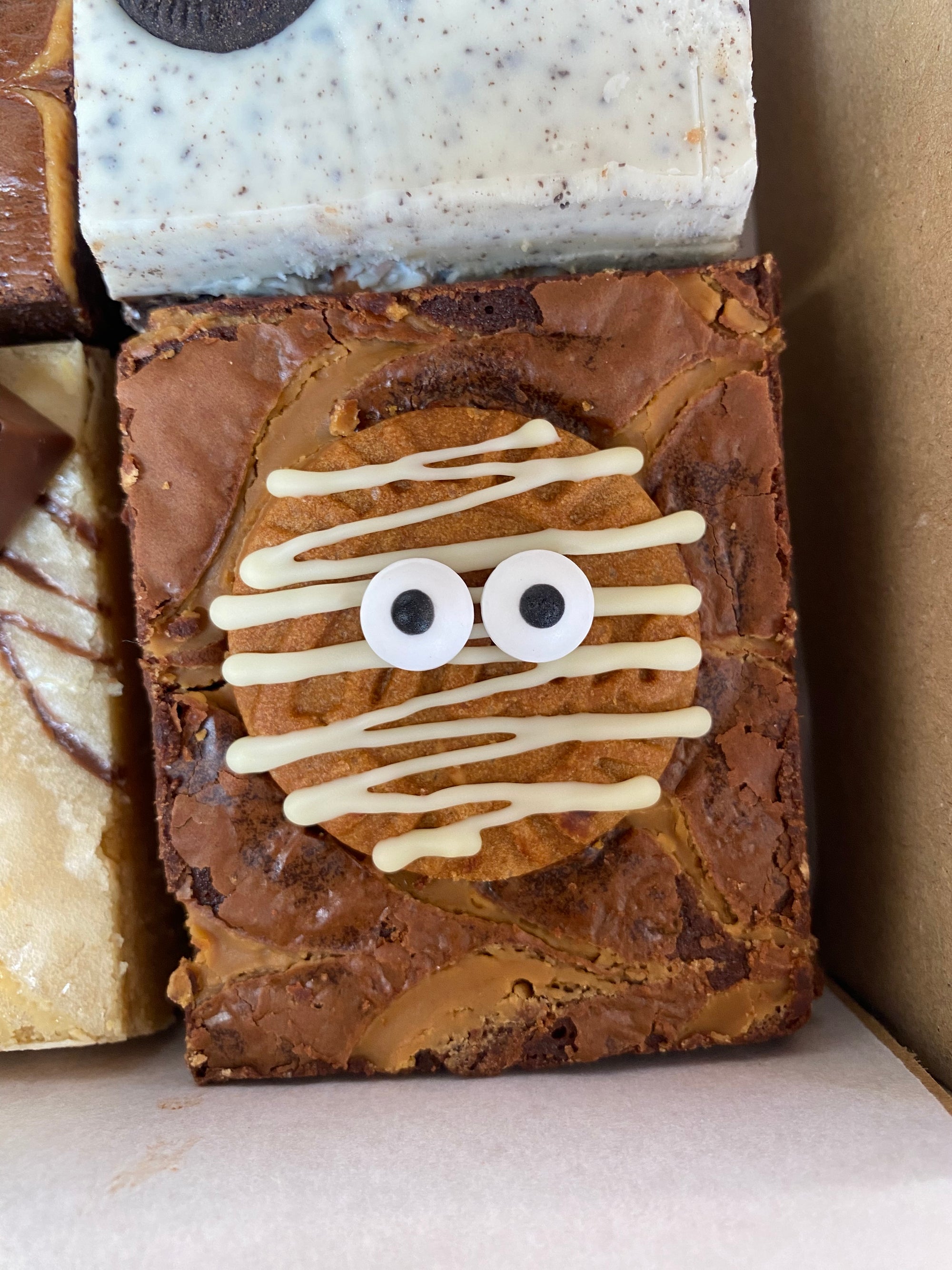 Biscoff Mummy Brownie: - Classic brownie with biscoff spread and biscoff biscuits in the middle, and a feathering of biscoff spread on top. Topped with a biscoff sandwich mummy decorated with white chocolate and edible eyes.