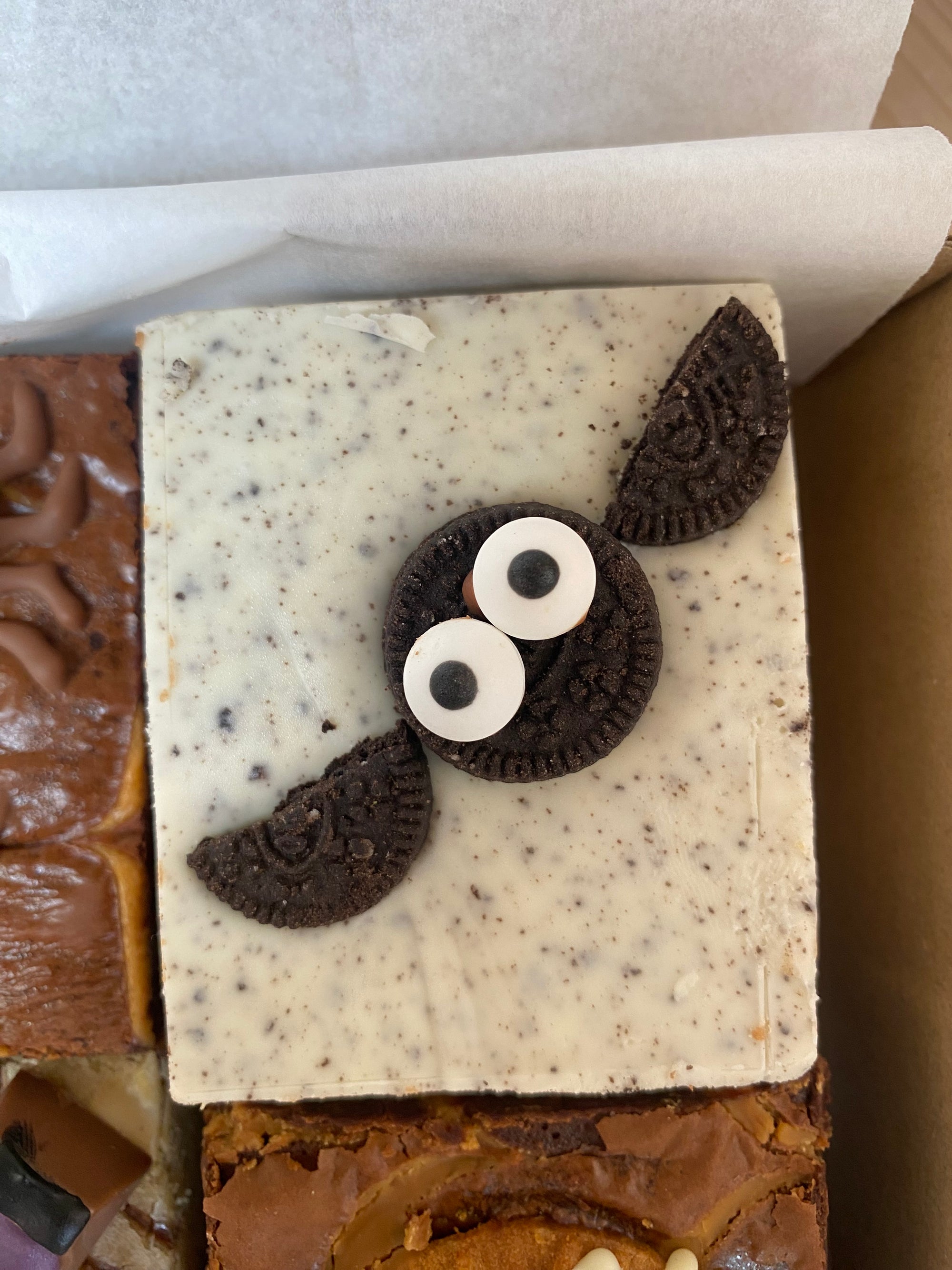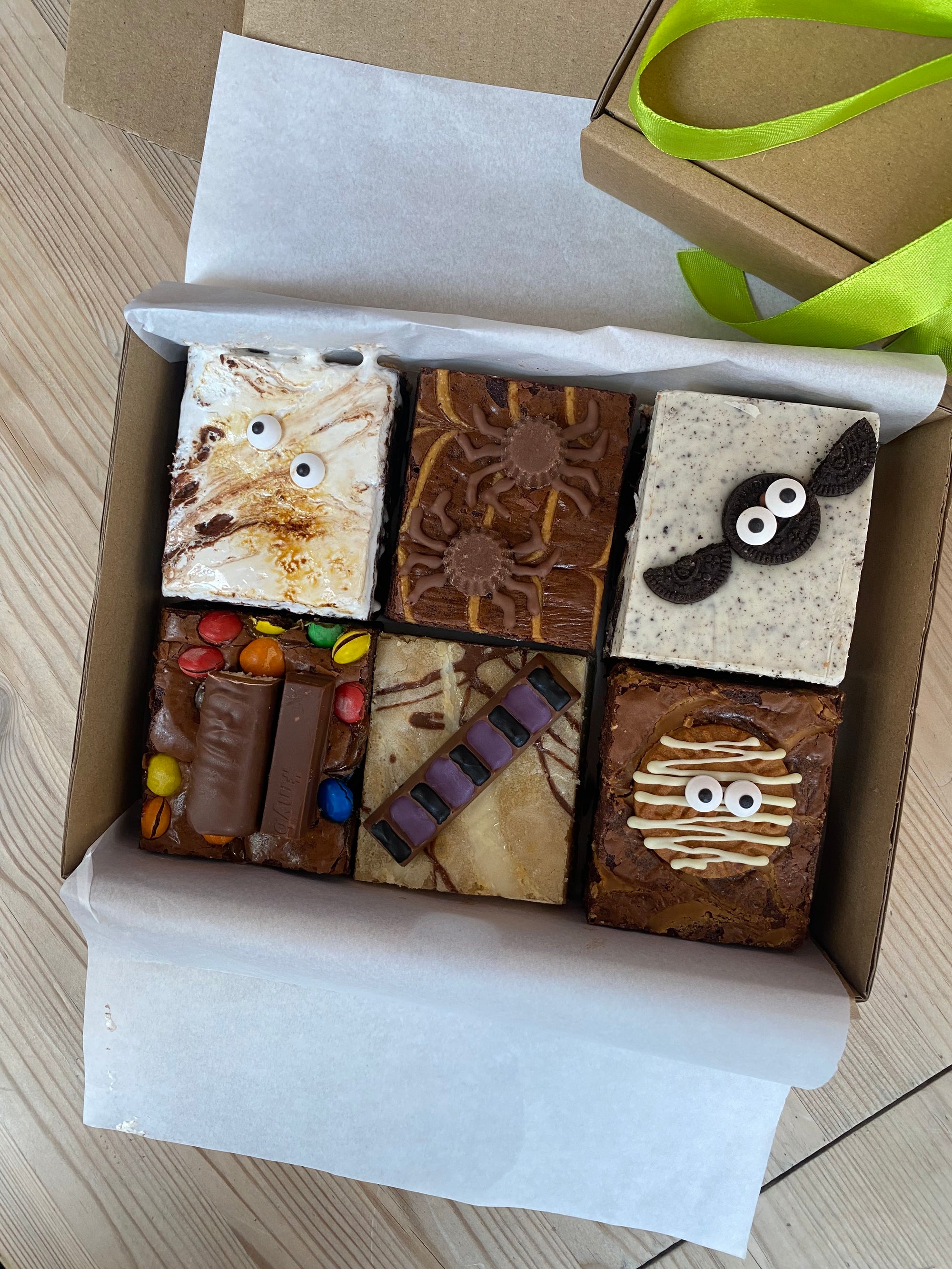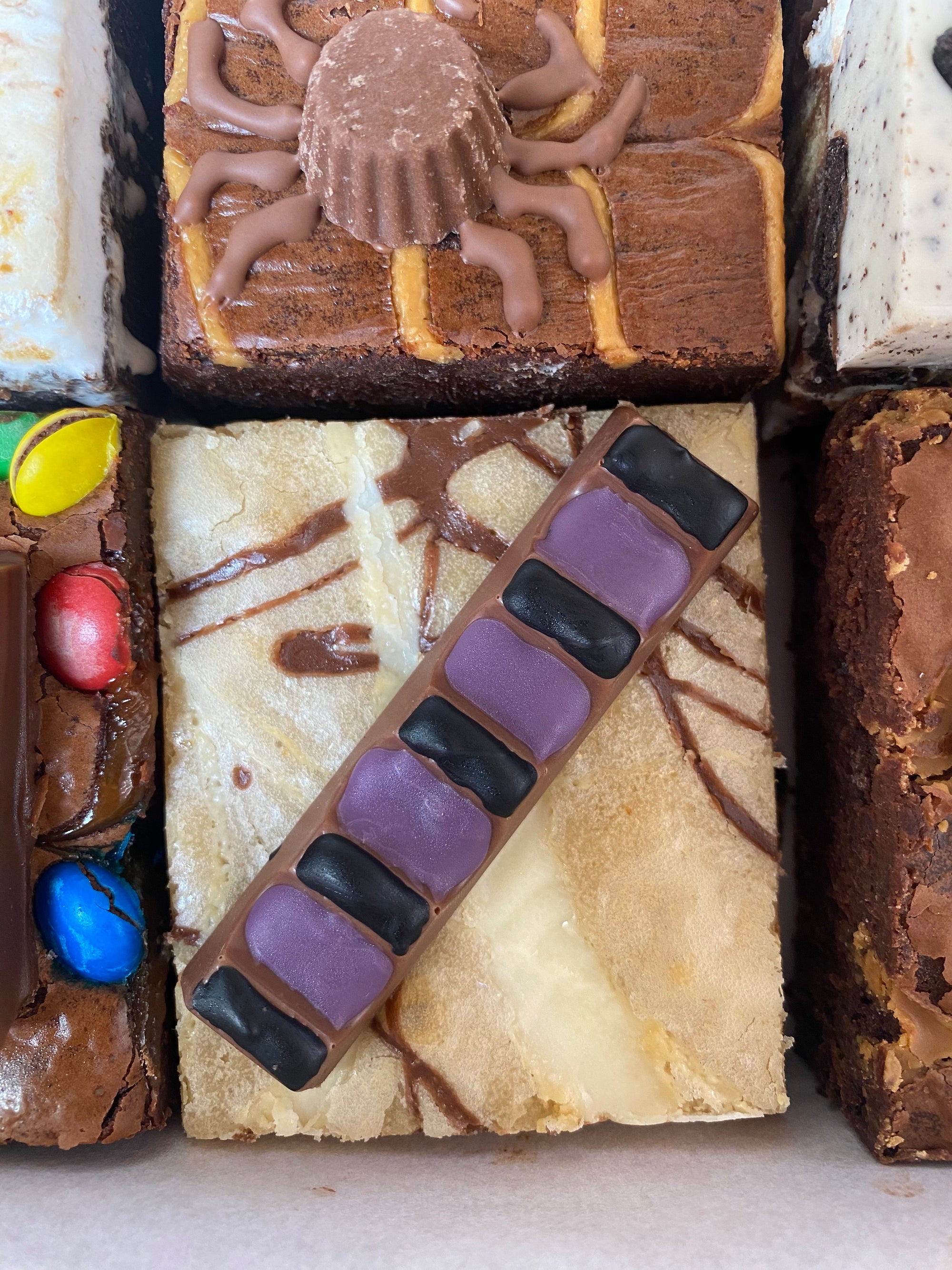Biscoff Mummy Brownie: - Classic brownie with biscoff spread and biscoff biscuits in the middle, and a feathering of biscoff spread on top. Topped with a biscoff sandwich mummy decorated with white chocolate and edible eyes.