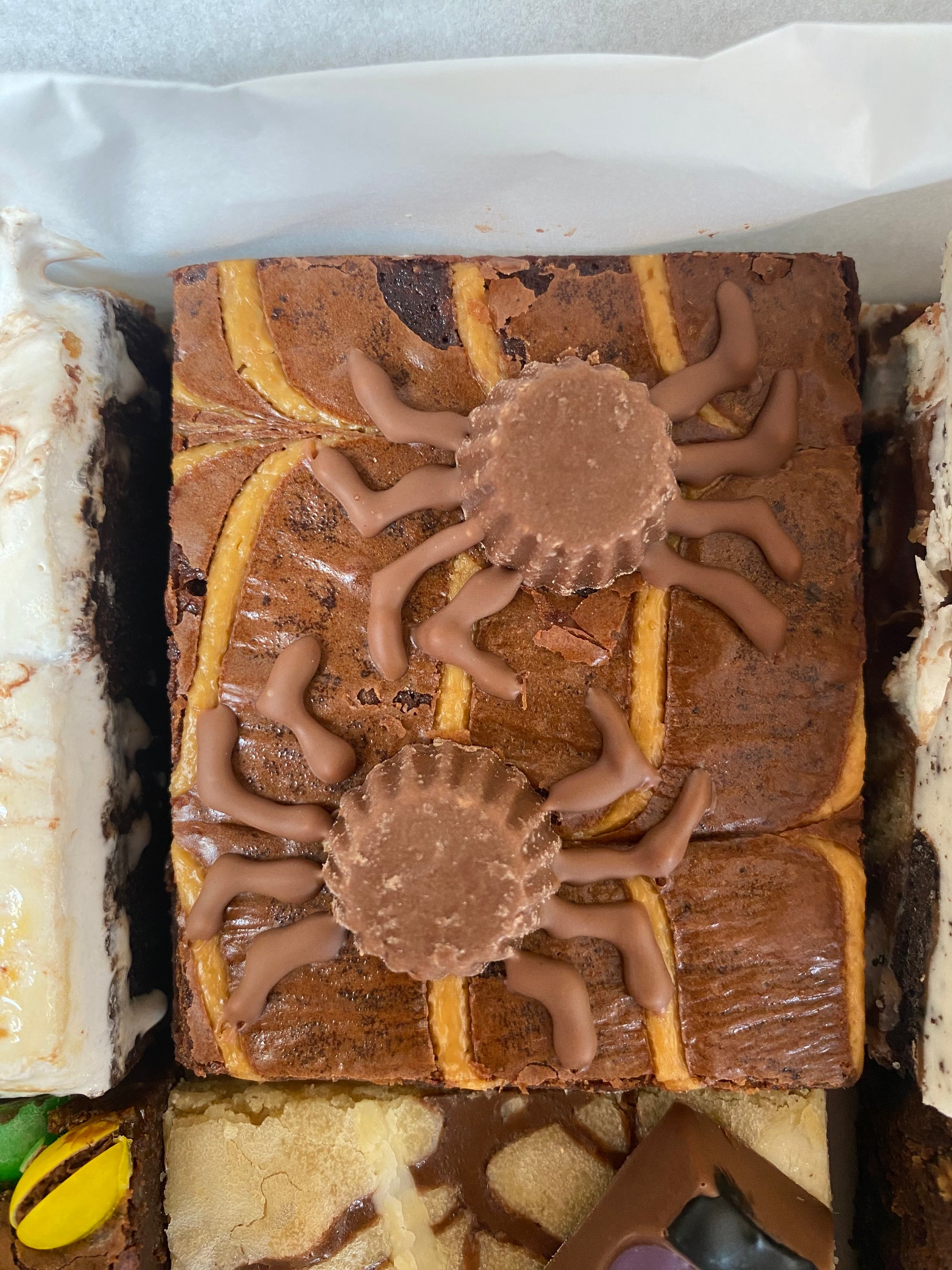 Peanut Butter Cup Spiders Brownie (GFI, N-Peanuts): - Classic brownie feathered with peanut butter. Topped with 2 mini pb cup spiders.