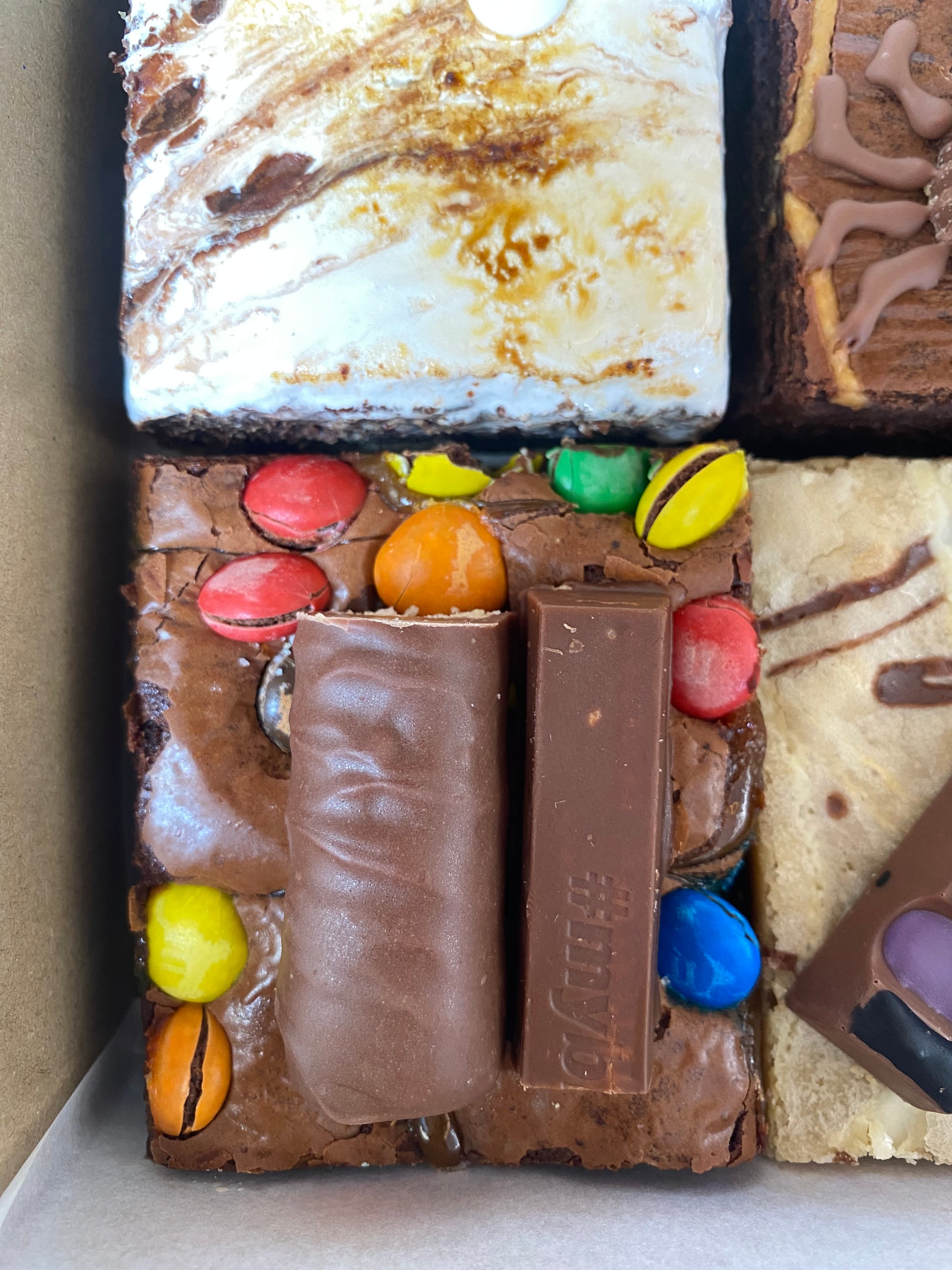 Trick or Treat Brownie: - Classic brownie feathered with dulce de leche and sprinkled with M&Ms. Finished with 1/2 Kitkat and 1/2 Twix.