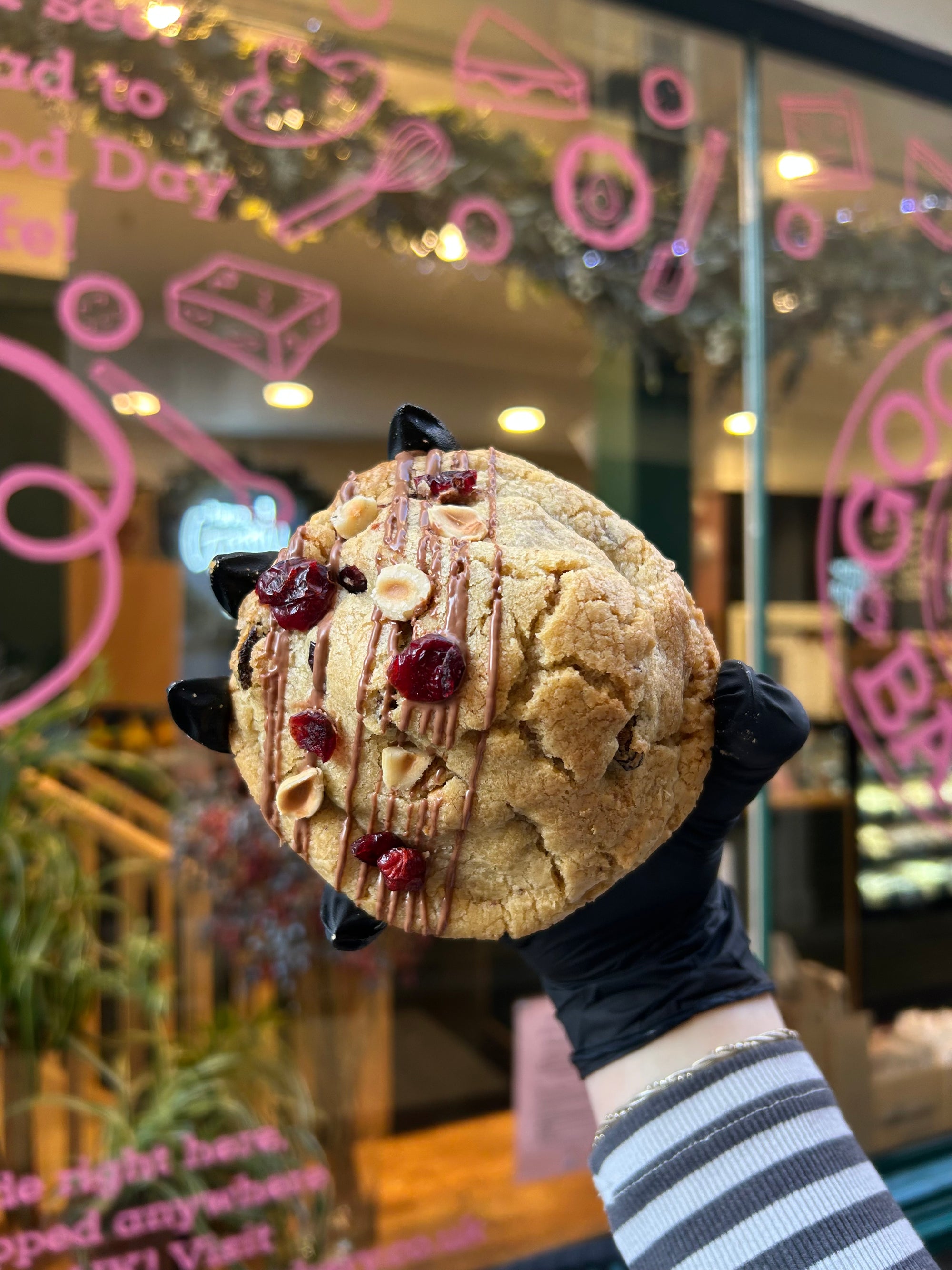 · Fruit and Nut- (N- Hazelnuts, Almonds)- Designed by Kristi - Hazelnuts, almonds, sultanas and dried cranberries cookie dough, stuffed with brownie and strawberry jam, finished with milk chocolate drizzle and a sprinkle of fruits and nuts