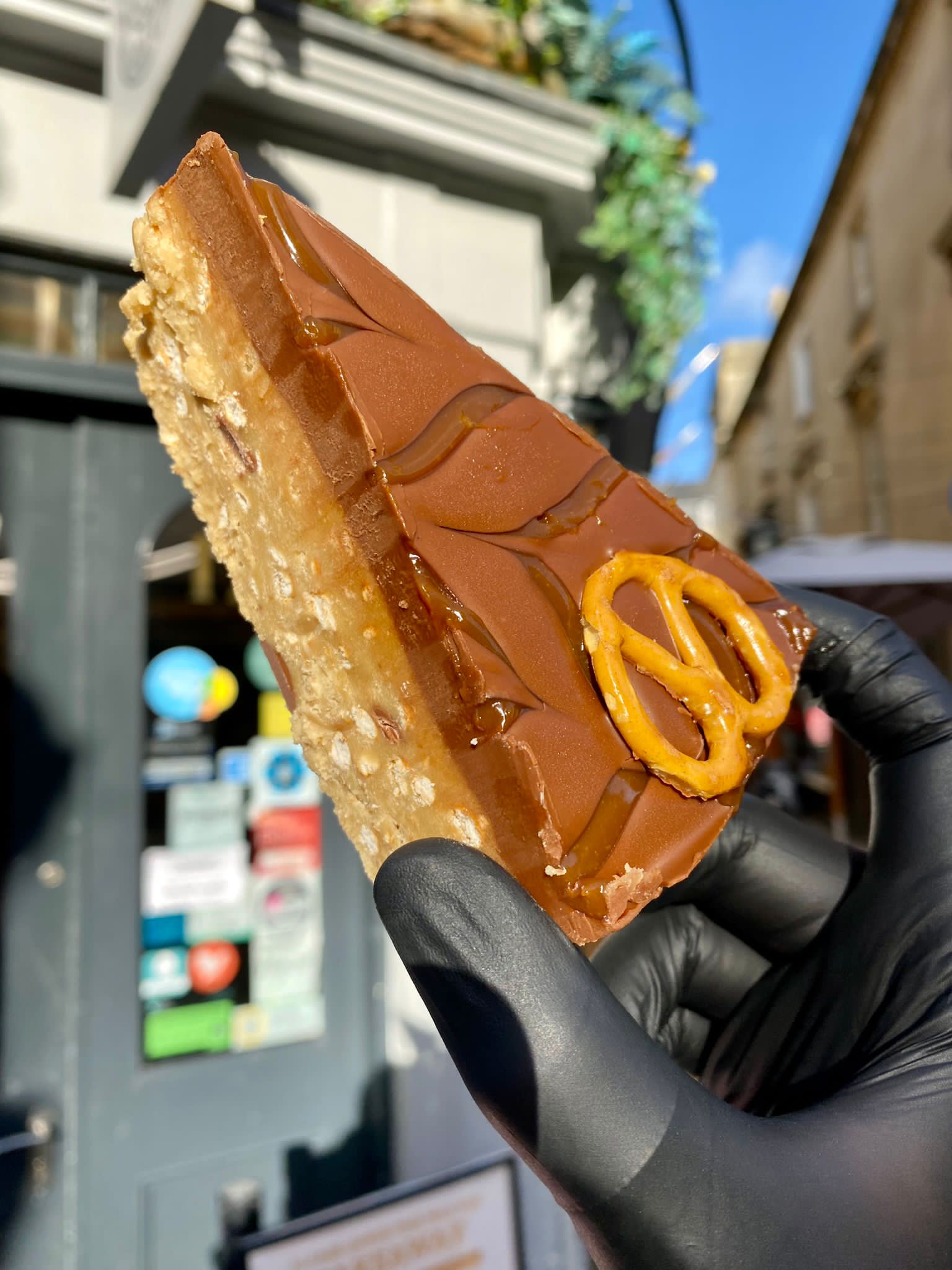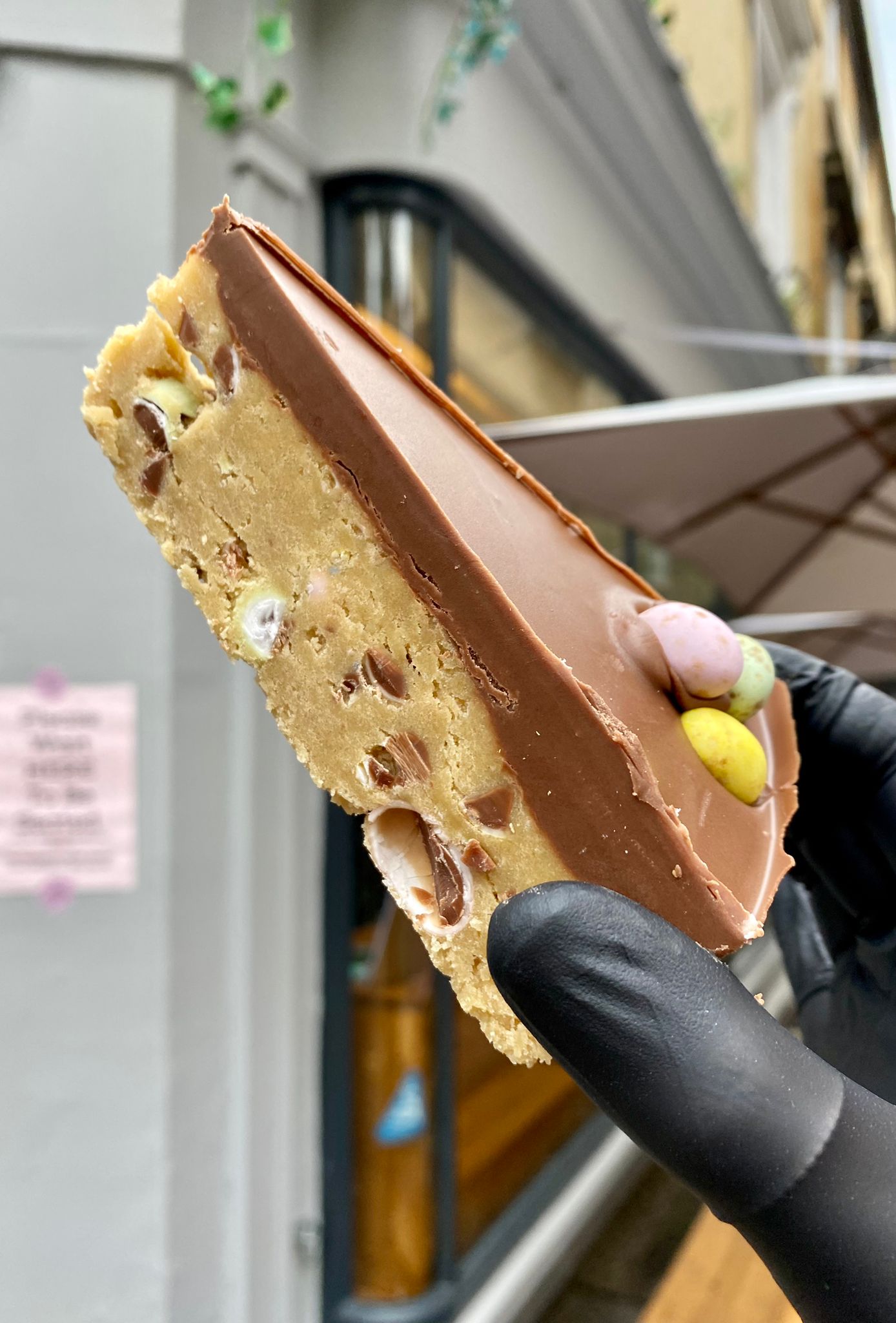 · S’mores Cookie Dough (Contains Gelatine) - Chocolate chip, digestive and mini marshmallow cookie dough. Topped with milk chocolate spread. Finished with a big toasted marshmallow and digestive crumb.
